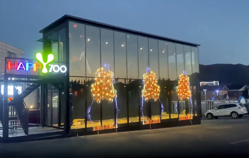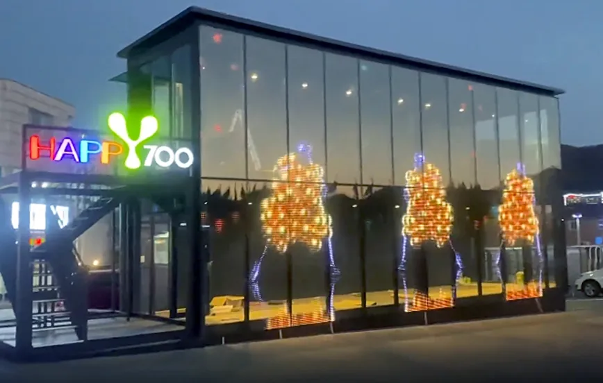 A romantic, interesting glass house, all made of transparent glass, the exterior glass and then decorated with LED film screen, to add more